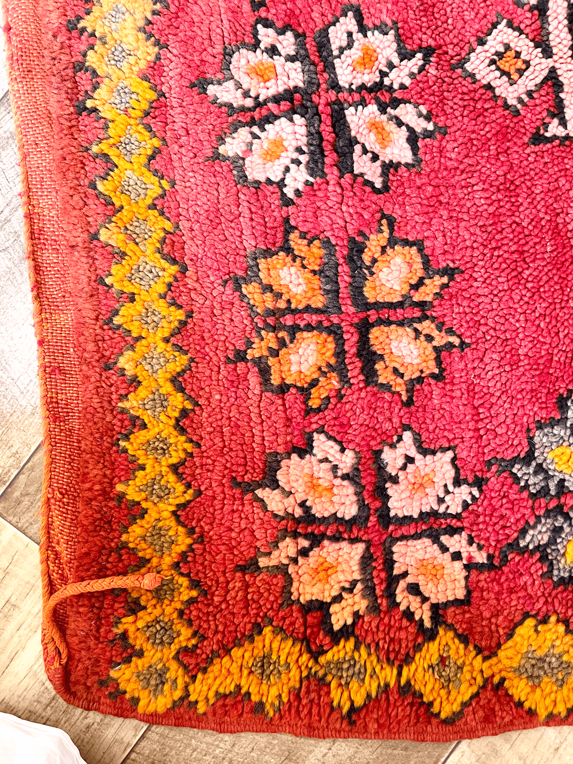 Bereichern Sie Ihr Interieur mit Aqaba, einem exquisiten Relikt des Zemour-Stammes, handgewebt in den 1980er Jahren. Dieser einzigartige Teppich mit den Maßen 90 cm x 132 cm bietet einen roten Vintage-Hintergrund, der eine uralte Leidenschaft und ein tiefes Erbe symbolisiert. Berbermuster, die sich in Schwarz- und Orangetönen entwickeln, zeichnen faszinierende tätowierte Symbole auf ihre Oberfläche und erinnern an die Traditionen und Geheimnisse der Vorfahren. Jeder fein gewebte Strang aus Schafwolle flüstert Geschichten aus einer anderen Zeit und hüllt Ihren Raum in Wärme und Geheimnis.