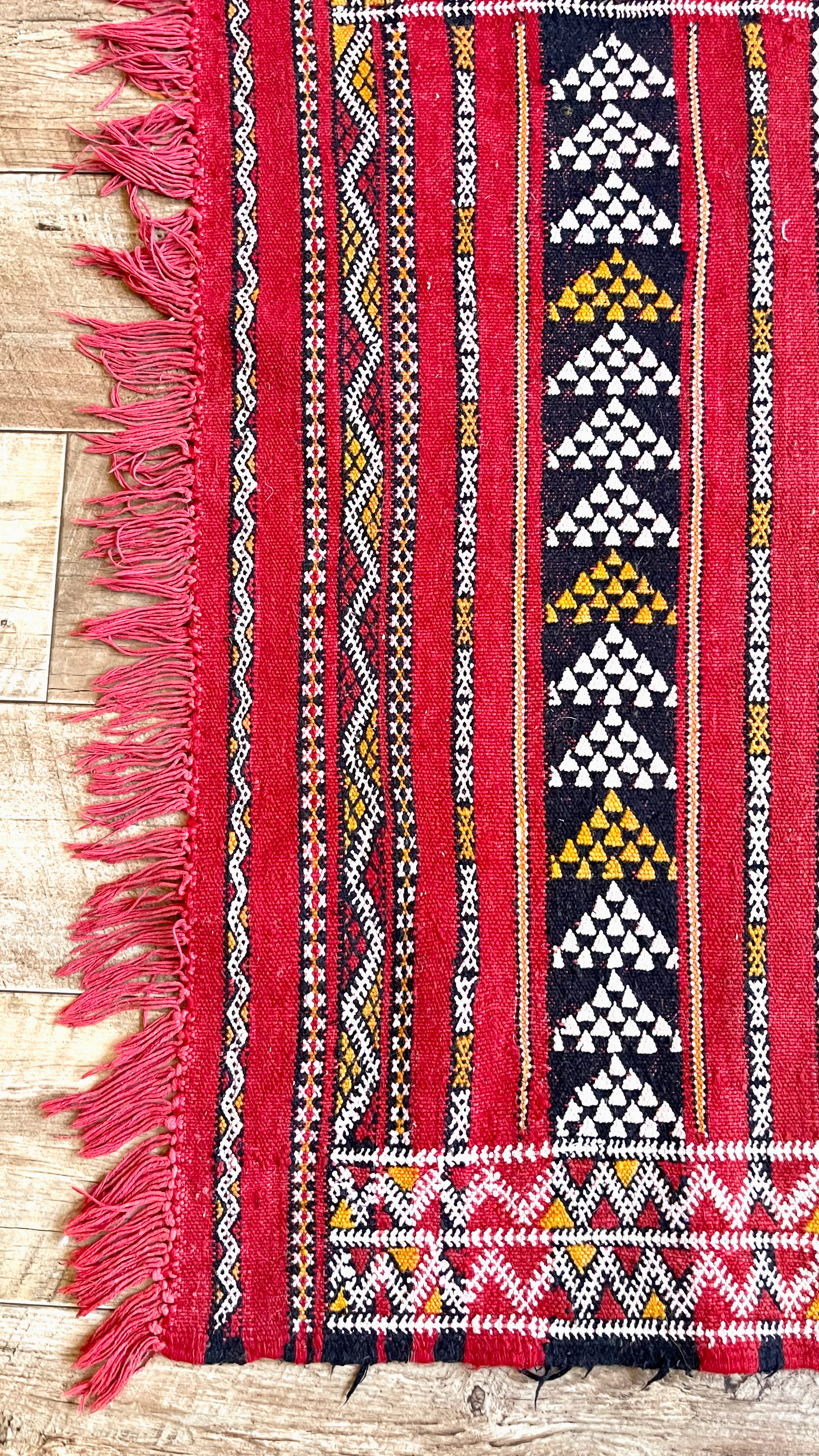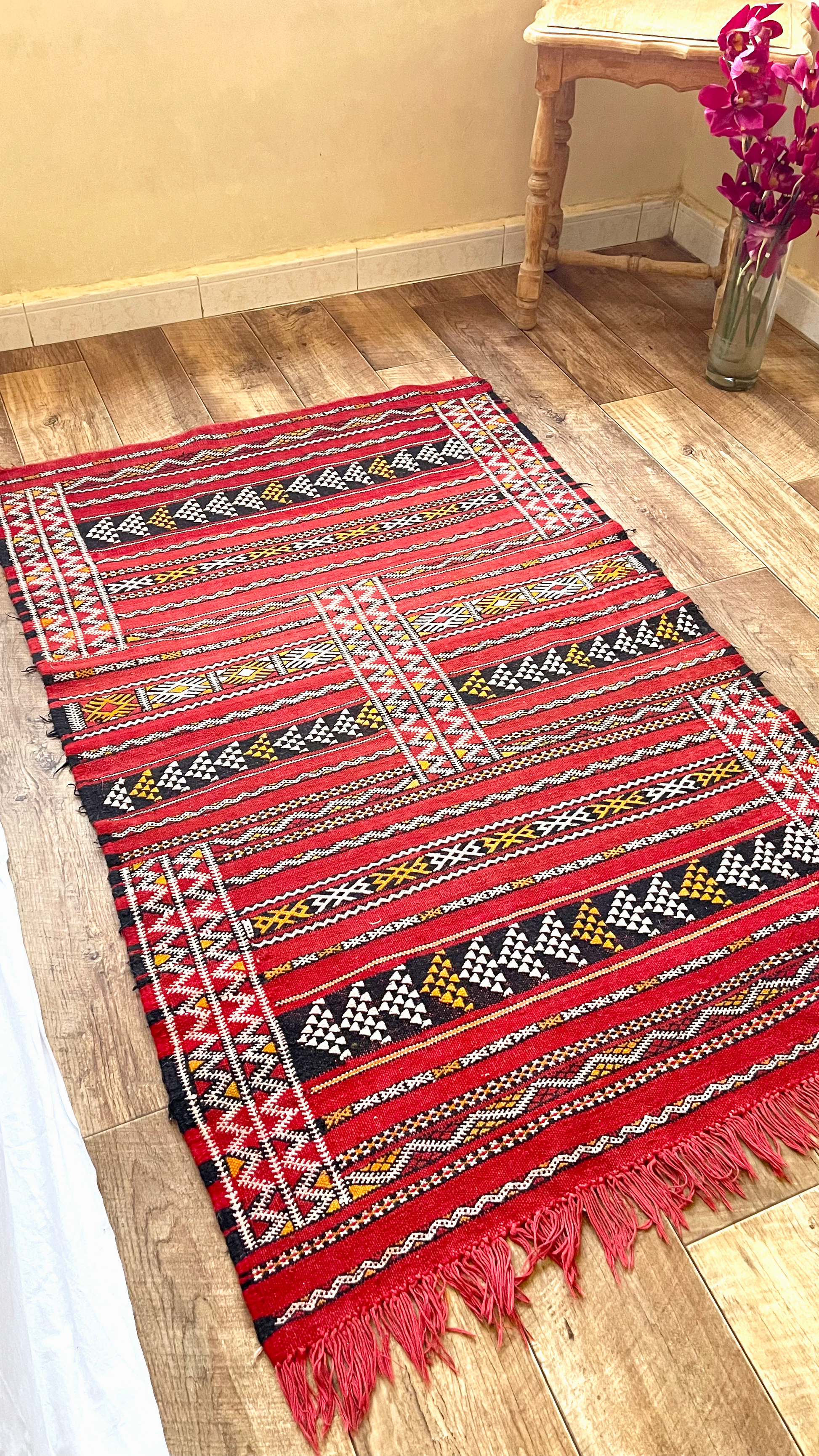 Entdecken Sie den Zauber der Vergangenheit mit Babila, einem Vintage-Kelim aus den späten 80er Jahren, einem echten gewebten Gedicht mit den Maßen 83 cm x 150 cm. Dieses einzigartige handgewebte Stück aus Schafwolle schafft visuellen Reichtum und lebendige Energie, indem es Ihre Räume umhüllt und durch einen leidenschaftlich roten Hintergrund an Berberlegenden erinnert. Auf der roten Leinwand zeichnen horizontale und vertikale Linien faszinierende Muster, die die Geheimnisse der Berberstämme flüstern und Geschichten über Ehre und Stolz erzählen, die in den Bergen und Tälern Marokkos verankert sind.
