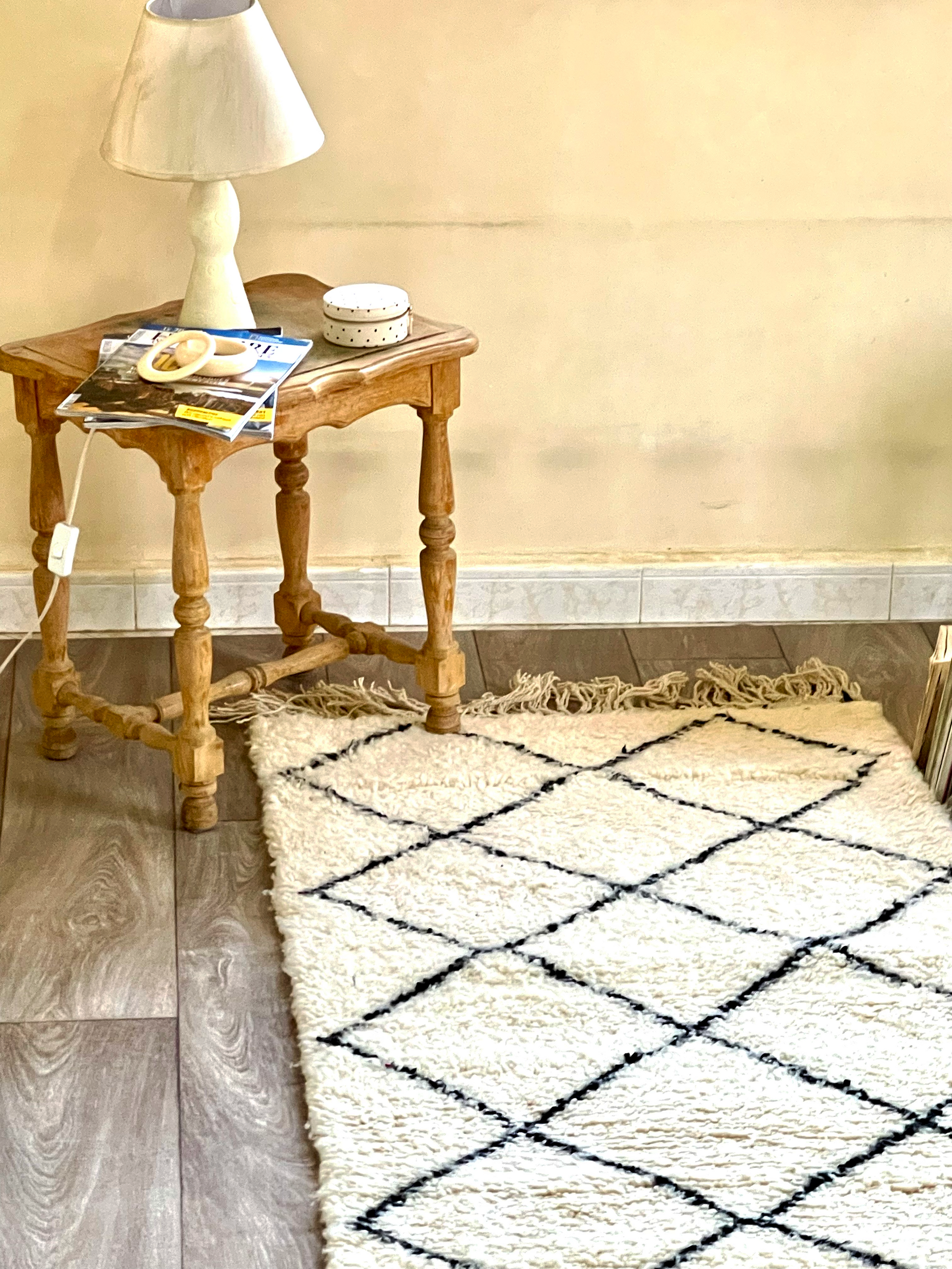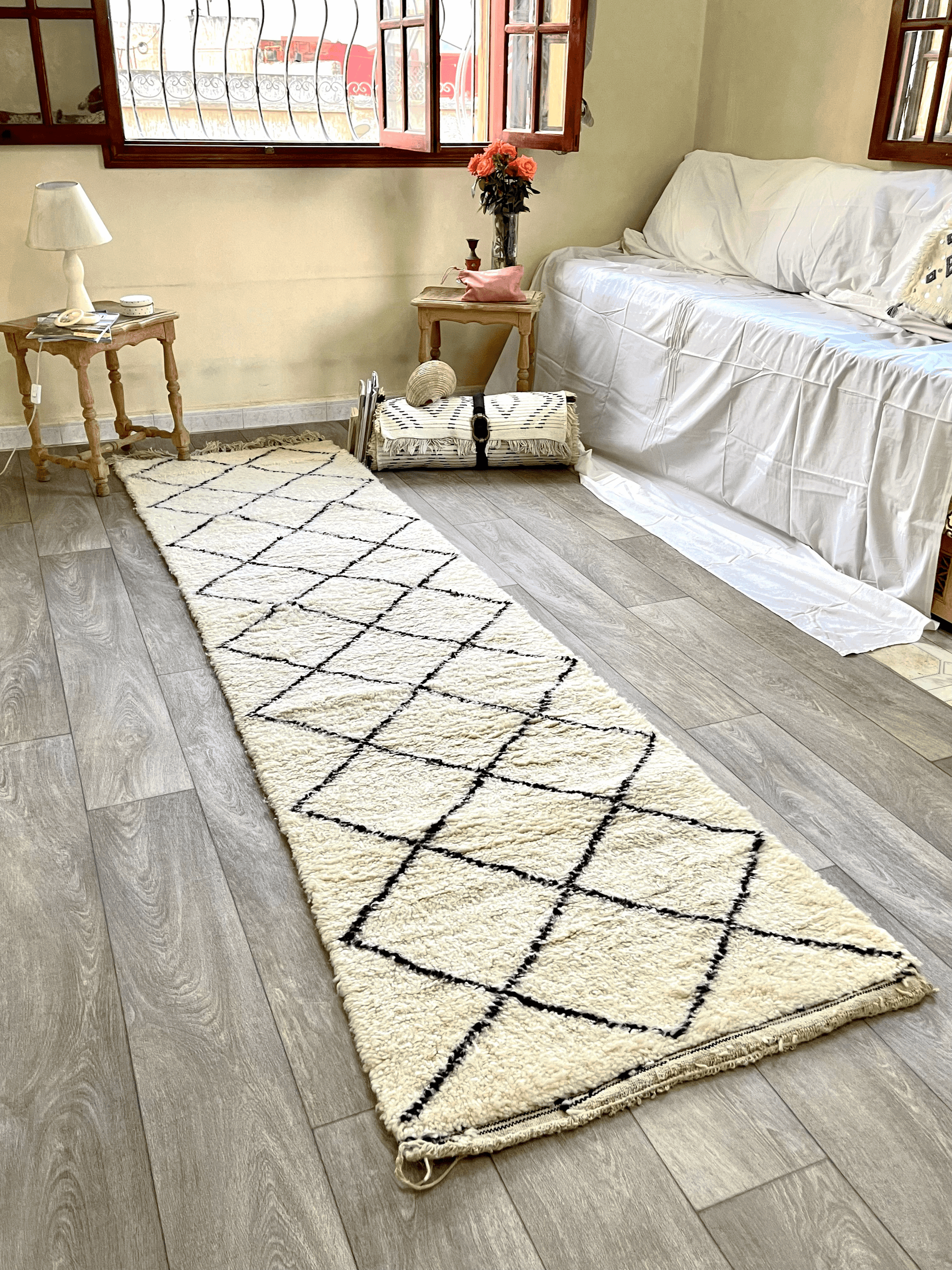 Tauchen Sie ein in Charme und Raffinesse mit Casablanca, einem vom Beni Ouarain-Stil inspirierten Teppich, der vom Zemour-Stamm des Mittleren Atlas handgefertigt wurde. Dieses einzigartige Stück mit den Maßen 80 cm x 320 cm ist aus reiner Schafwolle gewebt und verkörpert dezenten Luxus und unvergleichlichen Komfort. Casablanca bietet eine hellbeige Basis, die an die Ruhe und Eleganz der Wüste erinnert, wo schwarze Diamanten mit exquisiter Präzision gezeichnet werden und so ein raffiniertes Kontrastspiel und eine zeitlose Ästhetik entstehen.