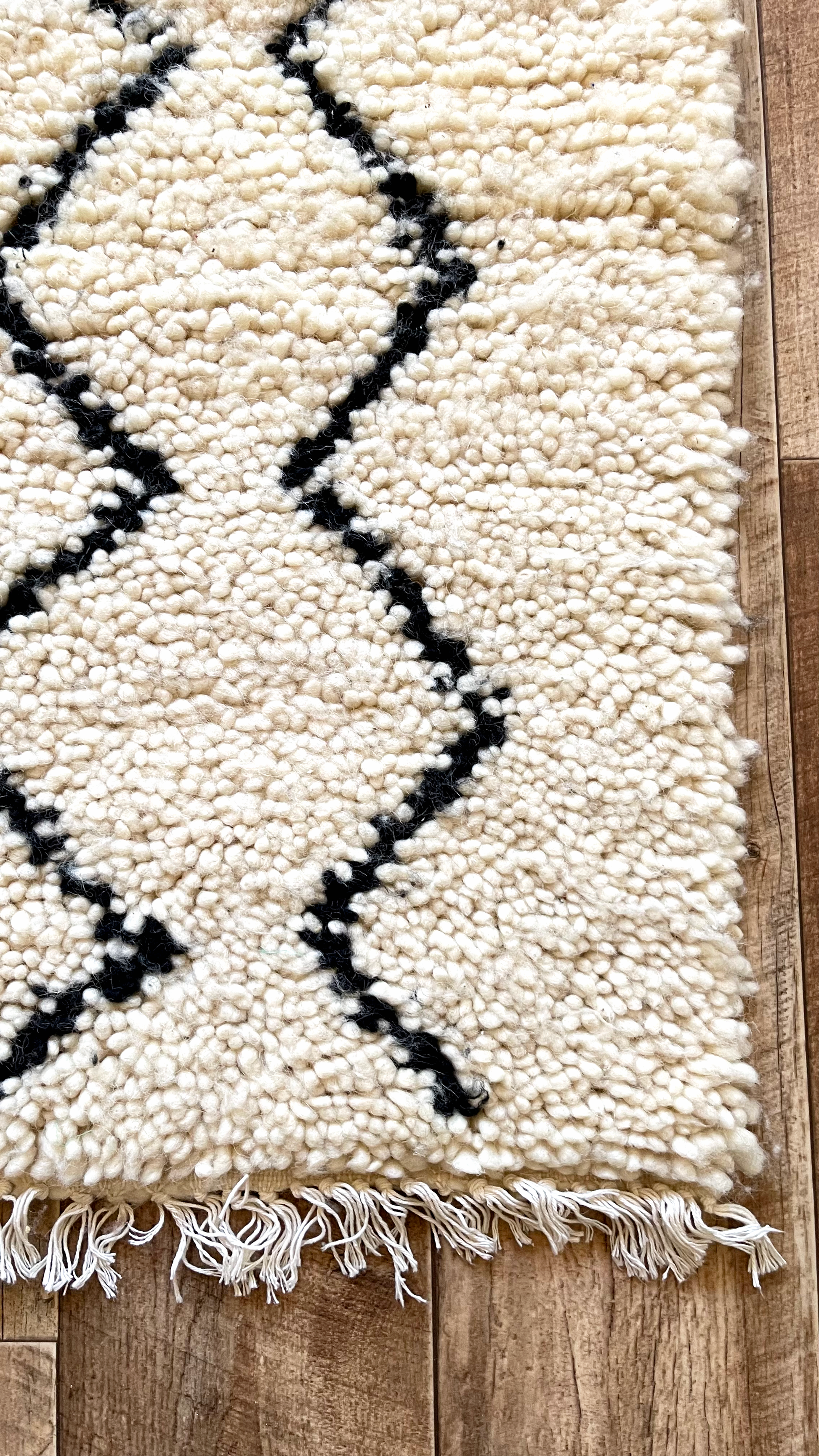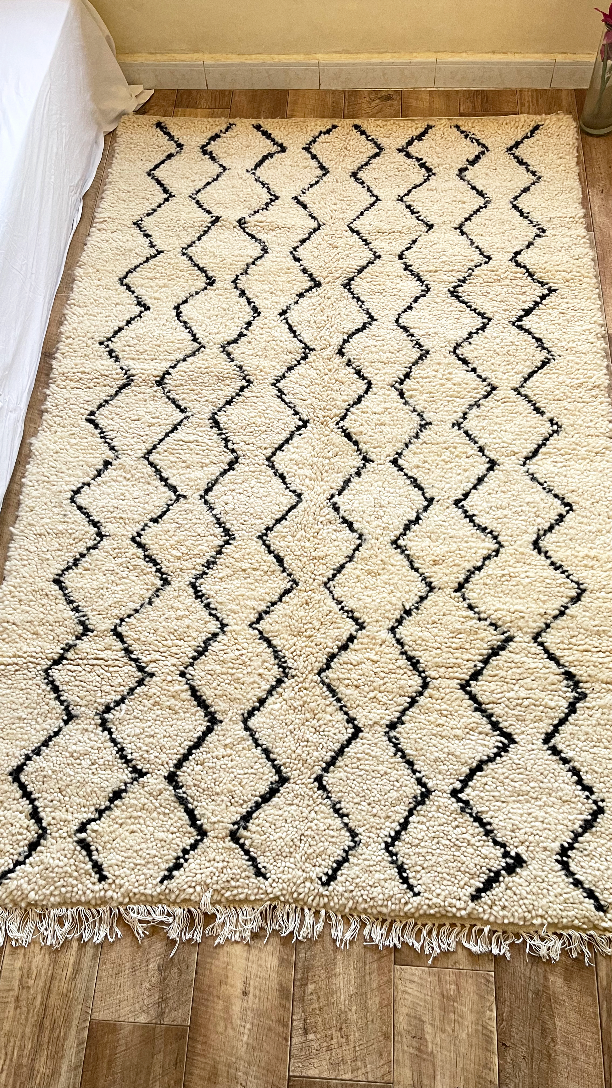 Entdecken Sie Authentizität mit Erfoud, einem traditionellen Béni Ouarain-Teppich, der mit seiner natürlichen beigen Wollstruktur und seinen grafischen schwarzen Zickzackmustern verführt. Mit den Maßen 130 cm x 210 cm verkörpert dieser handgewebte Berber-Teppich das Erbe und das Know-how der marokkanischen Berber-Kunsthandwerker. Die dynamischen Zickzacklinien von Erfoud erzählen Geschichten über die Traditionen der Vorfahren, die Berberkultur und das Nomadenleben.