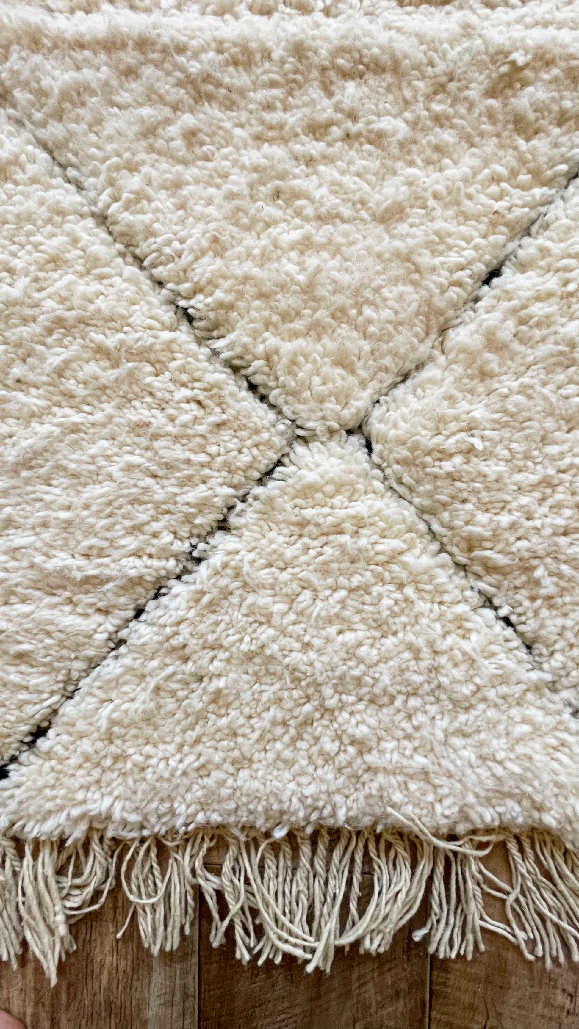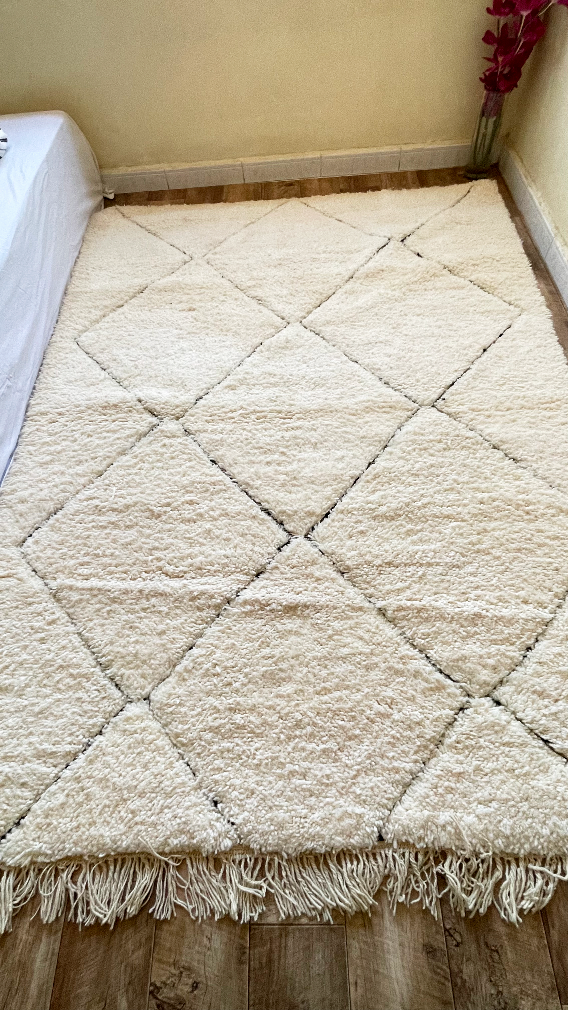 Hama, ein außergewöhnlicher Béni Ouarain, offenbart durch seine großzügigen Abmessungen von 160 cm x 225 cm ein Refugium voller Luxus und Eleganz. Dieser Teppich ist in einem reinen, makellosen Beige gehalten und verfügt über fein geschnitzte schwarze Linien, die große Rauten bilden, die für eine Reliefdimension und eine reiche, üppige Textur sorgen. Jede Schafwollfaser, präzise zu einem Baumwollschuss verwoben und von Hand geformt, erzählt eine Geschichte von Authentizität und Berbertradition. Hama überschreitet Räume und setzt ein elegantes Statement in einem einladenden Wohnzimmer, einem warmen Schlafzimmer, einem eleganten Büro oder einem eleganten Esszimmer. Seine Beigetöne und schwarzen Details sorgen für perfekte Harmonie und fügen sich elegant in eine Vielzahl von Einrichtungsstilen ein, von modernen und minimalistischen Ambienten bis hin zu klassischen oder böhmischen Dekoren. Sorgfältig im Eingangsbereich oder unter einem Couchtisch aus Glas oder Holz platziert, strahlt Hama seine luxuriöse Aura aus und verleiht Ihrem Raum einen bezaubernden Hauch von Berbermagie.