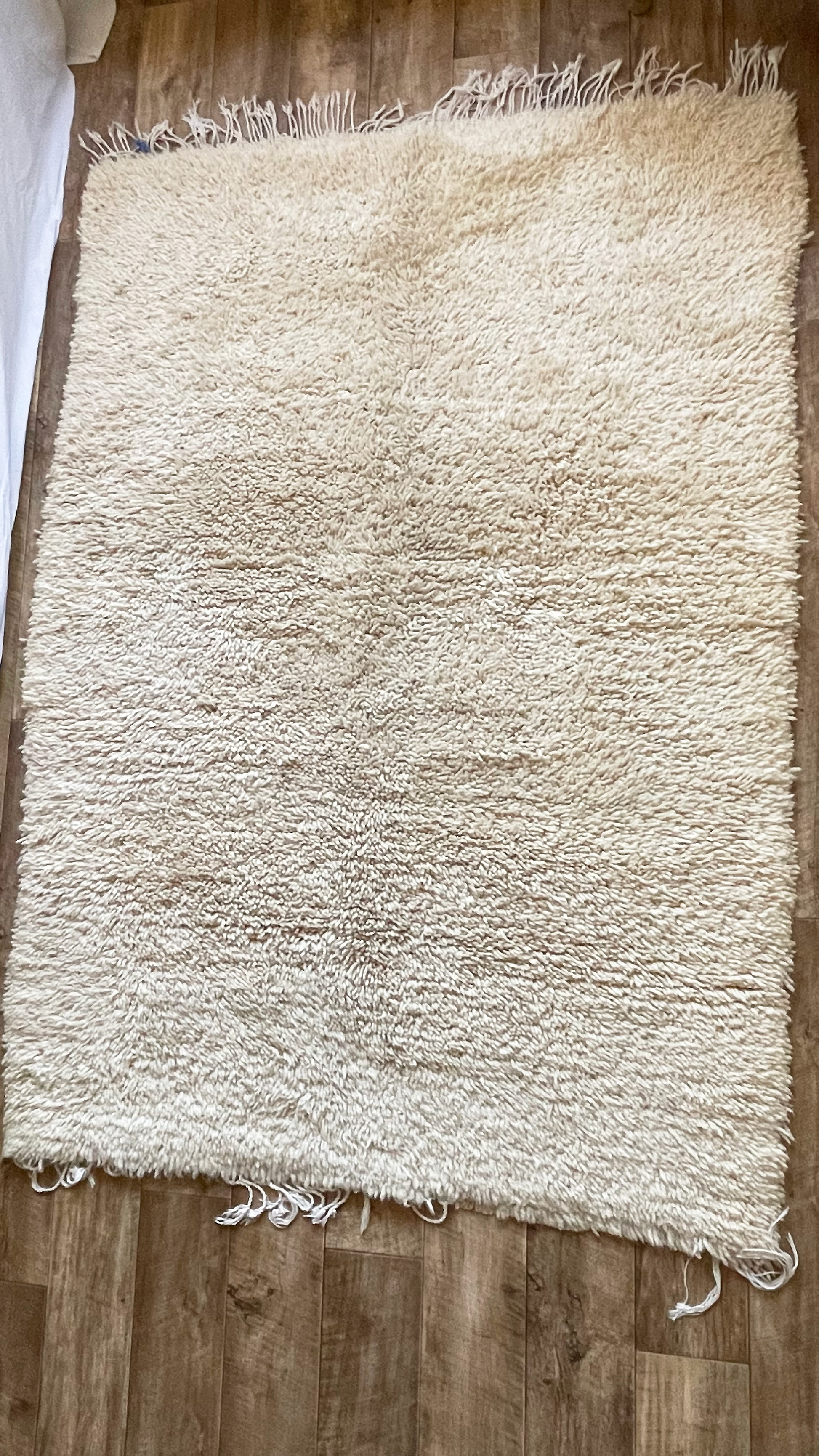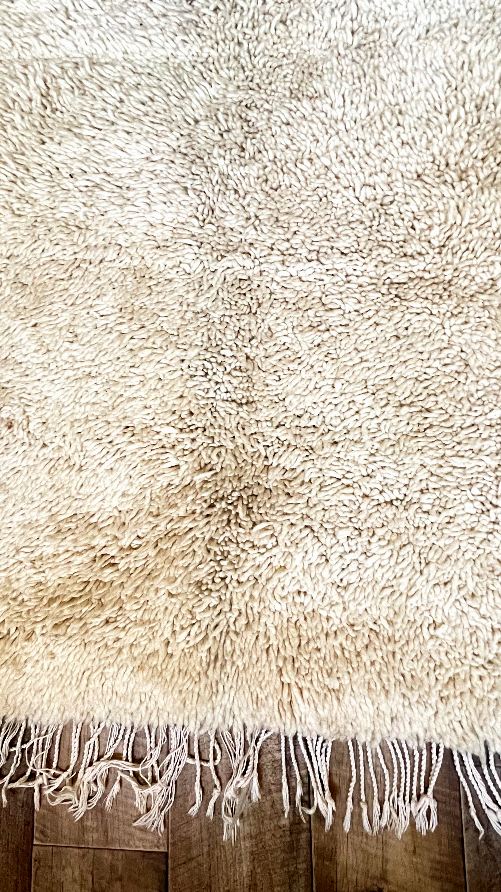 Ifrane, ein authentischer und prächtiger Béni Ouarain, stellt einen Stoff der Gelassenheit und Weichheit dar, präzise gewebt in einheitlichen Beigetönen, die an Creme, Sand und Elfenbein erinnern. Dieses einzigartige Stück mit den großzügigen Maßen 115 cm x 200 cm ist in sorgfältiger Handarbeit aus dicker Wolle gefertigt und spiegelt die Finesse und den Reichtum des Berber-Know-hows aus dem Mittleren Atlas wider. Mit seiner eleganten Schlichtheit und beruhigenden Volltonfarbe schafft Ifrane eine Oase der Ruhe und Wärme, perfekt für Räume, die Ruhe und Entspannung suchen. Die üppige Textur seiner dicken Wolle lädt zum Komfort und zur Entspannung ein und verwandelt jeden Moment in ein zartes Sinneserlebnis. Jede Ifrane-Faser wird mit beispielloser Präzision und Sorgfalt gewebt und ist eine Hommage an die Berberkunst und ästhetische Harmonie der Vorfahren. Seine zeitlose und moderne Eleganz macht ihn zum idealen Begleiter für zeitgenössische, minimalistische oder skandinavische Innenräume und verleiht ihm einen Hauch von Weichheit und Natürlichkeit. Ifrane ist perfekt geeignet, um ein Wohnzimmer, ein gemütliches Schlafzimmer oder ein elegantes Büro zu verschönern. Es zeichnet sich durch diskreten Luxus und Vielseitigkeit aus und erinnert an natürliche Schönheit und marokkanische Authentizität. Verleihen Sie Ihrem Raum die Ruhe und Eleganz von Ifrane und lassen Sie diesen authentischen Béni Ouarain eine Geschichte von Kultur, Tradition und Luxus in Ihr Interieur einfließen.
