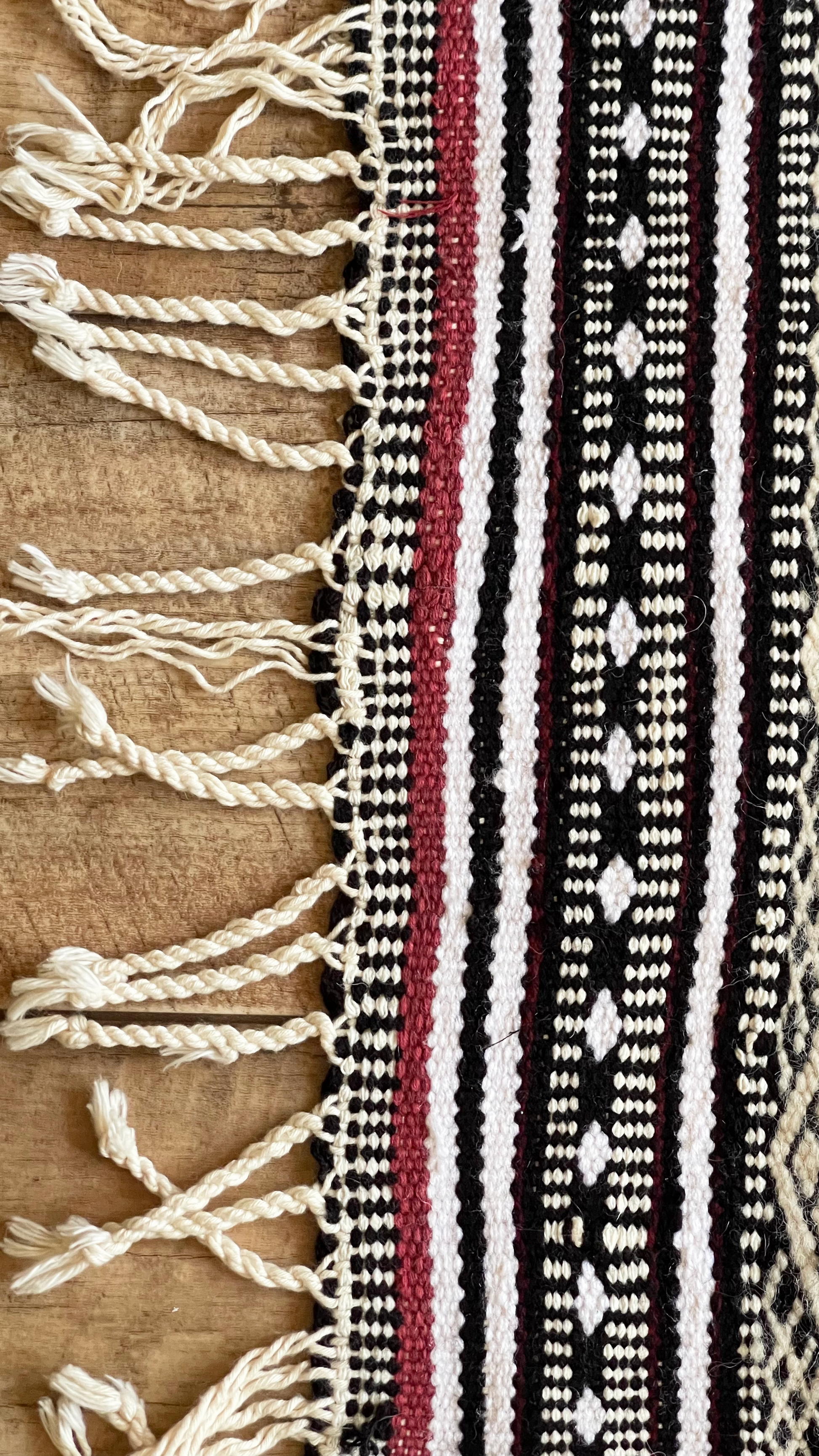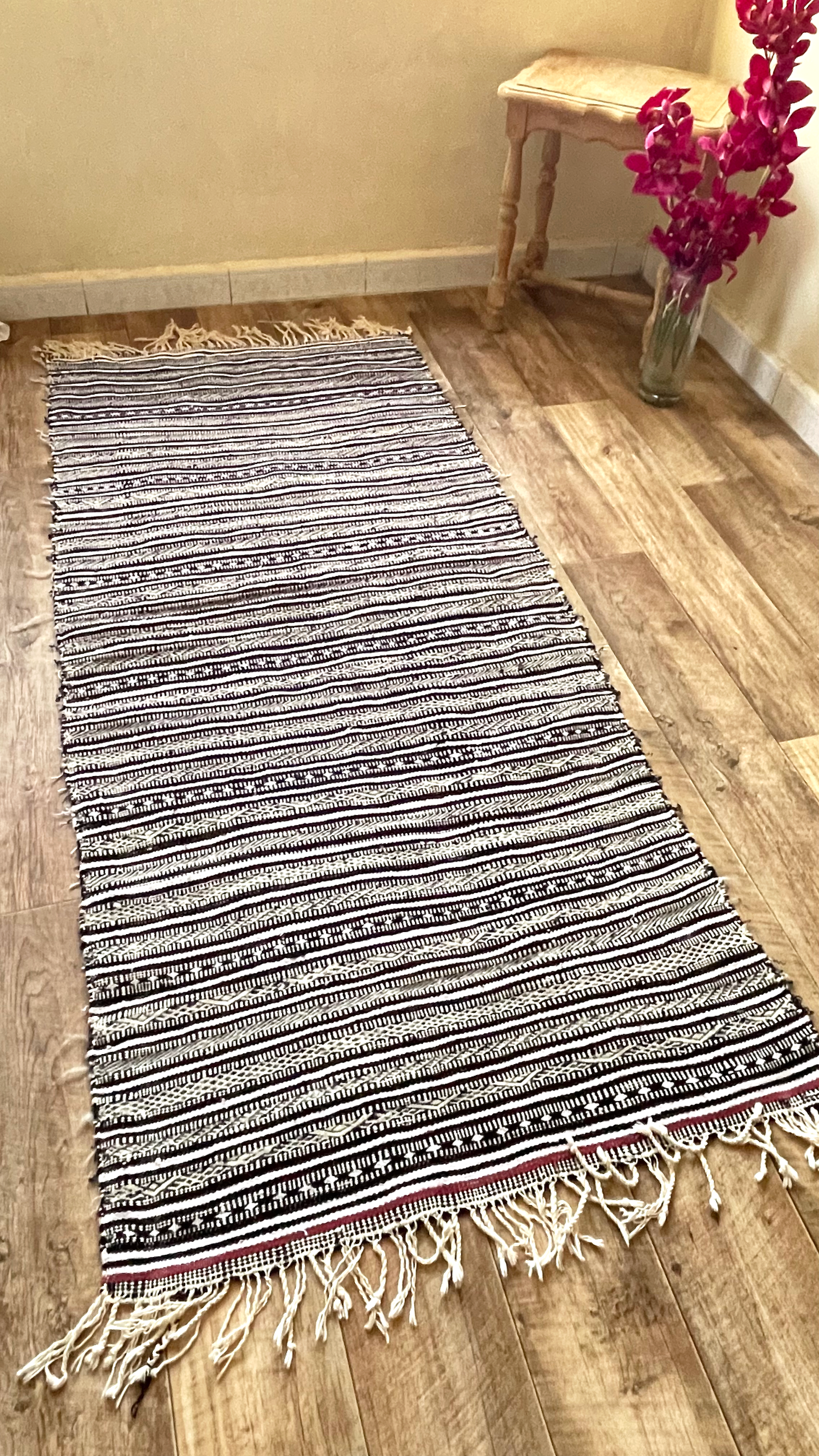 Irbid, eine spektakuläre Komposition des Stammes der Béni Ouarain, präsentiert sich als außergewöhnlicher Kelim, der die Feinheit der marokkanischen Berber-Handwerkskunst verkörpert. Mit den Maßen 80 cm x 200 cm ist dieses einzigartige Werk aus einer Mischung aus Wolle und Baumwolle das Ergebnis sorgfältiger Handarbeit und stellt eine spürbare Hommage an das uralte Know-how der Berber-Handwerker dar. Mit vertikalen Mustern in Schwarz, Weiß und Beige, unterbrochen von feinen roten Linien, erinnert Irbid an Berber-Tattoos, schafft eine harmonische visuelle Balance und schafft eine warme Atmosphäre in jedem Raum. Ob in einem eleganten Flur, einem eleganten Wohnzimmer oder einem beruhigenden Schlafzimmer, Irbid verleiht jedem Interieur raffinierten Charme und einen modernen Touch und fügt sich nahtlos in verschiedene dekorative Ambiente ein. Lassen Sie Irbid Ihren Raum mit seinem unaufdringlichen Luxus und seinem authentischen Reiz bereichern und erleben Sie die zeitlose Schönheit und den luxuriösen Komfort, den es bietet, während Sie in die Geschichte und Kultur der Berber eintauchen.