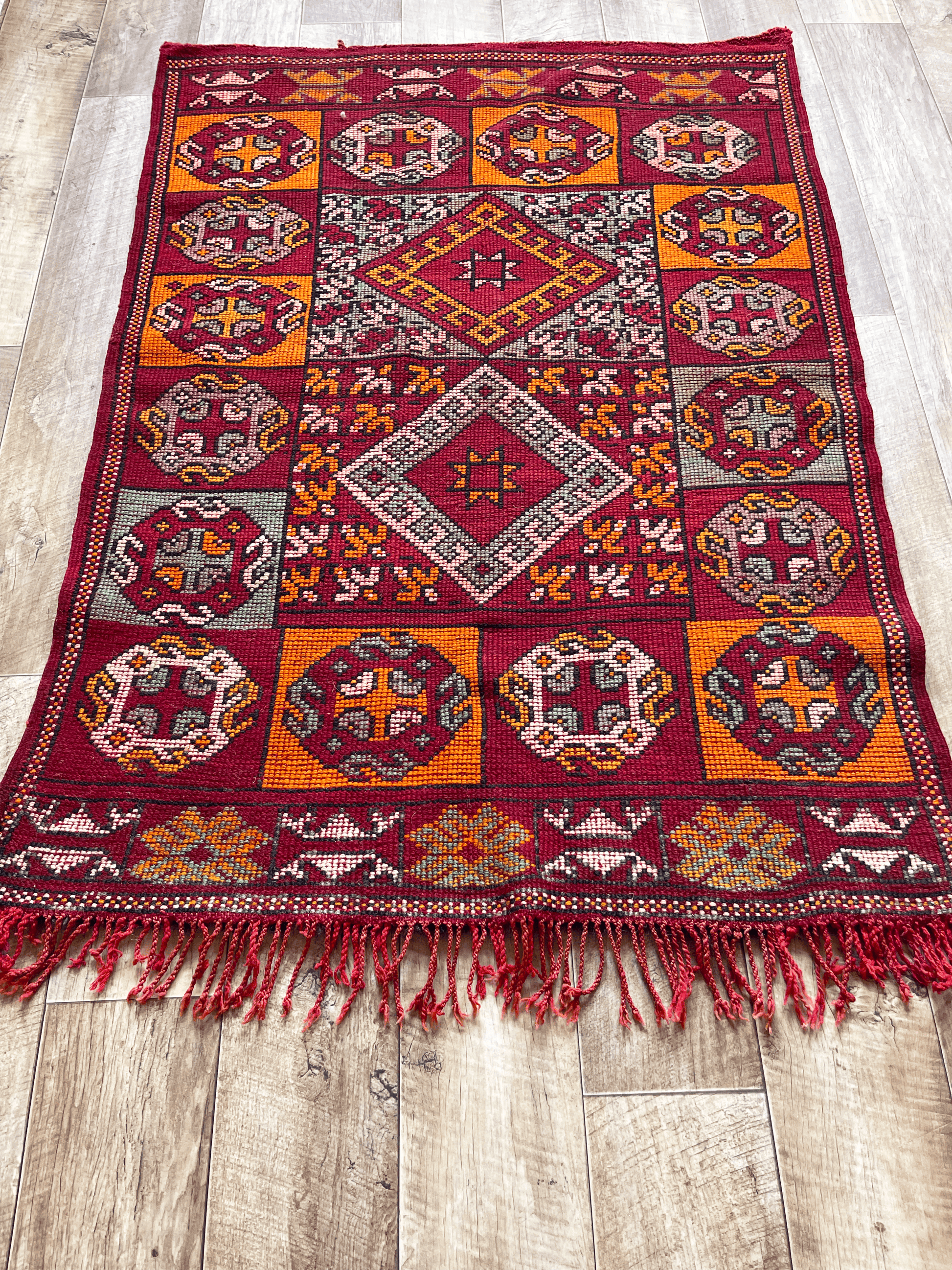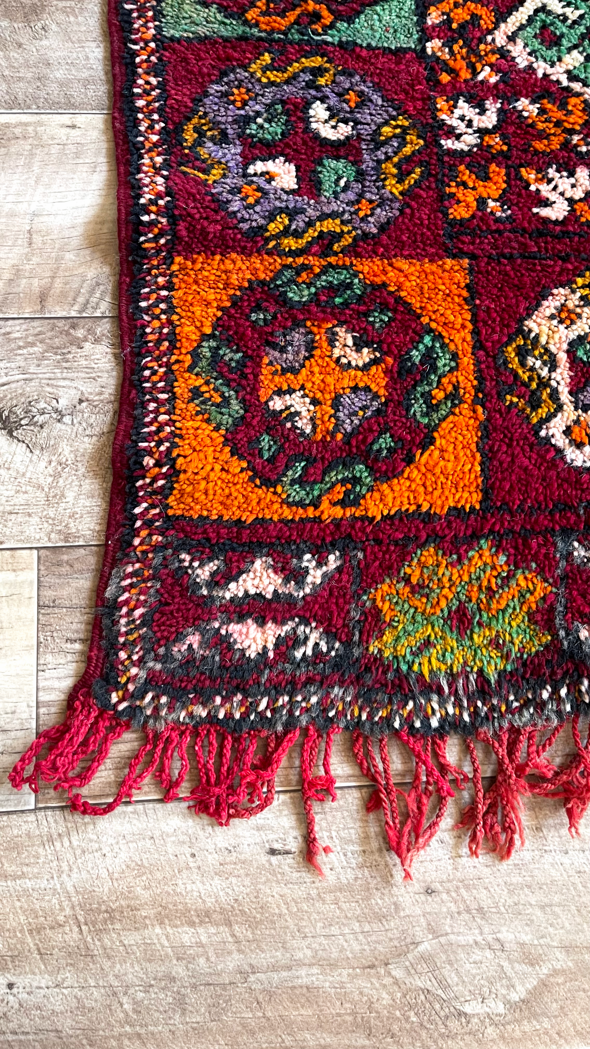 Willkommen in der Welt des Zemour Ispahan-Teppichs, einer einzigartigen und luxuriösen Kreation aus den 80er Jahren. Mit den Maßen 100 cm x 146 cm besticht Ispahan mit seinem vintage-roten Hintergrund, einem lebendigen Zeugnis der Nuancen der Geschichte, Augen und Herzen. Die Isfahan-Designs erinnern an authentische Berber-Tattoos mit Orange- und Schwarztönen, die innerhalb des intensiven Rots einen malerischen und emotionalen Dialog erzeugen. Dieses sorgfältig handgewebte Stück aus reiner Schafwolle spiegelt die uralten Traditionen und die zeitlose Kunst des Zemour-Stammes wider. Mehrdimensionaler dekorativer Zauber: Isfahan passt in seiner roten Pracht wunderbar zu raffinierten Innenräumen und verleiht jedem Raum Wärme und Fülle, egal ob es sich um ein geheimnisvolles Schlafzimmer, ein einladendes Wohnzimmer oder ein elegantes Büro handelt. Warme Töne ergänzen sich ideal mit holzigen Texturen, edlen Metallen und edlen Textilien und schaffen eine visuelle Symphonie. Betrachten Sie diesen Teppich, der an die Exotik der 80er Jahre erinnert, in verschiedenen Räumen und spüren Sie seine luxuriöse Wirkung und Harmonie mit verschiedenen Farbpaletten. Es ist eine Einladung zu einer sinnlichen und visuellen Reise, die den Horizont Ihres ästhetischen Universums erweitert.