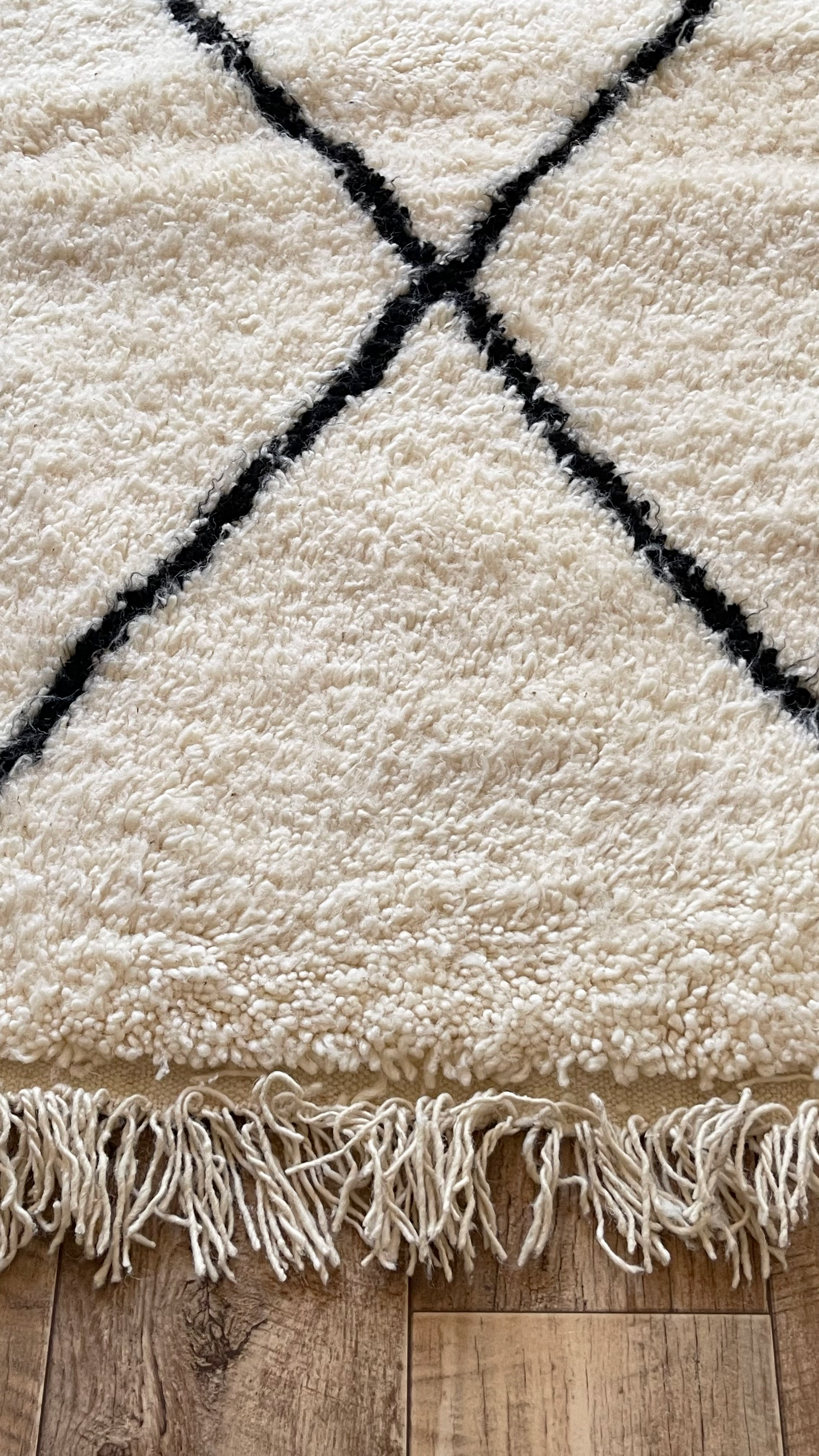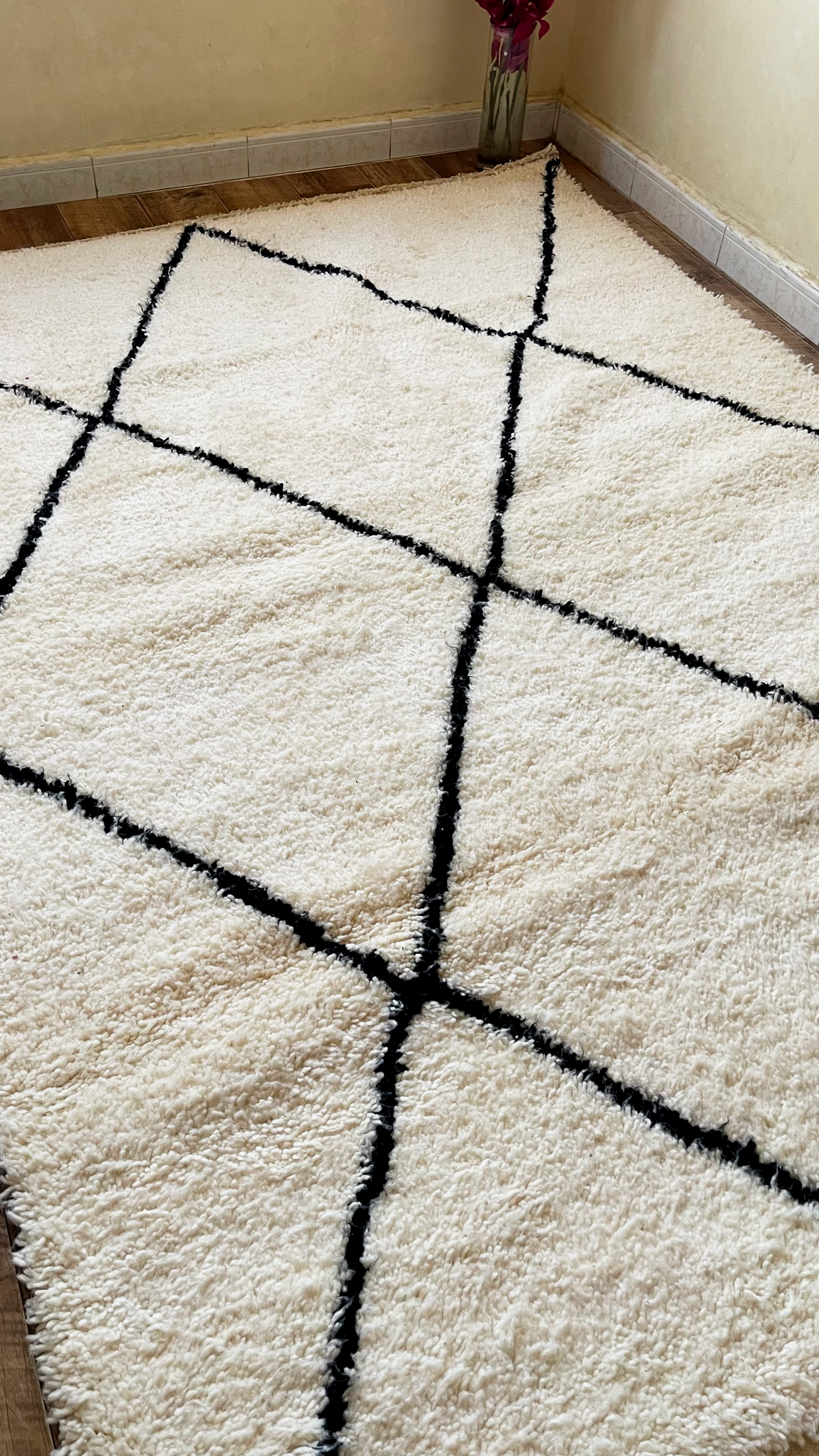 Izmir, ein symbolträchtiges Stück der Kreationen von Béni Ouarain, offenbart sich als luxuriöser Berberteppich, der Ihren Wohnraum verwandeln soll. Mit den Maßen 155 cm x 222 cm stellt dieses einzigartige, sorgfältig handgewebte Kunsthandwerksstück ein erhabenes Echo authentischer Berberkunst und ein wahres Meisterwerk aus hochwertiger Schafwolle dar. Mit seinen Ecru-Beige-Tönen, bereichert durch große schwarze Diamanten, verspricht Izmir einen eleganten Look und unvergleichlichen Komfort. Es strahlt eine Atmosphäre der Ruhe und des diskreten Luxus aus und macht jeden Raum zu einem warmen und einladenden Raum. Ideal, um den Charme eines eleganten Wohnzimmers, eines eleganten Schlafzimmers oder eines anspruchsvollen Büros zu verstärken, passt Izmir seine zeitlose und moderne Ausstrahlung an verschiedene Umgebungen an und bietet ein bereicherndes Sinneserlebnis. Lassen Sie sich von Izmir mit seiner natürlichen Eleganz und außergewöhnlichen Qualität verführen. Es ist nicht nur ein Teppich, sondern eine Einladung zum Reisen, zur Erkundung einer reichen Kultur und zum Erleben von authentischem und zeitlosem Luxus.
