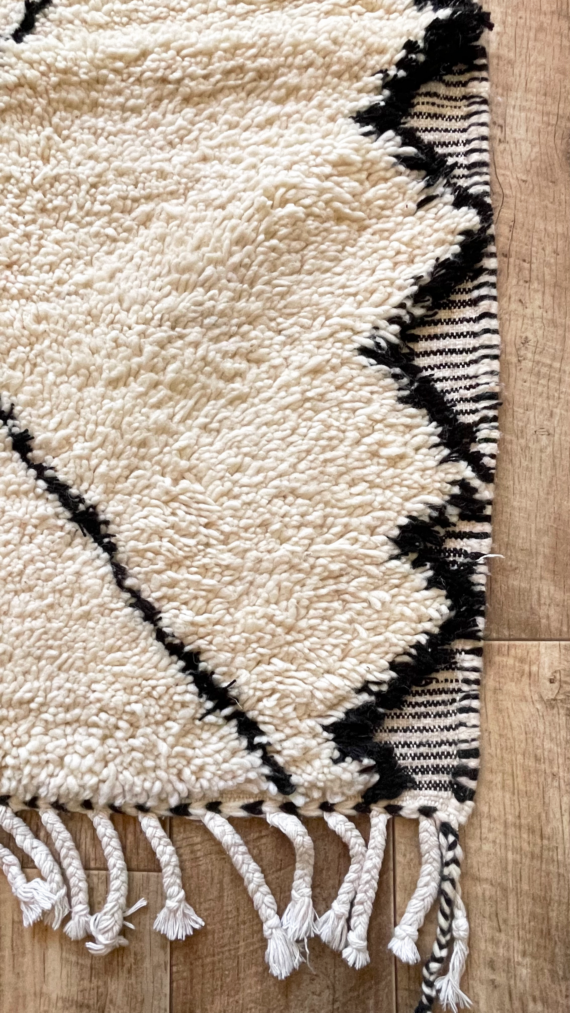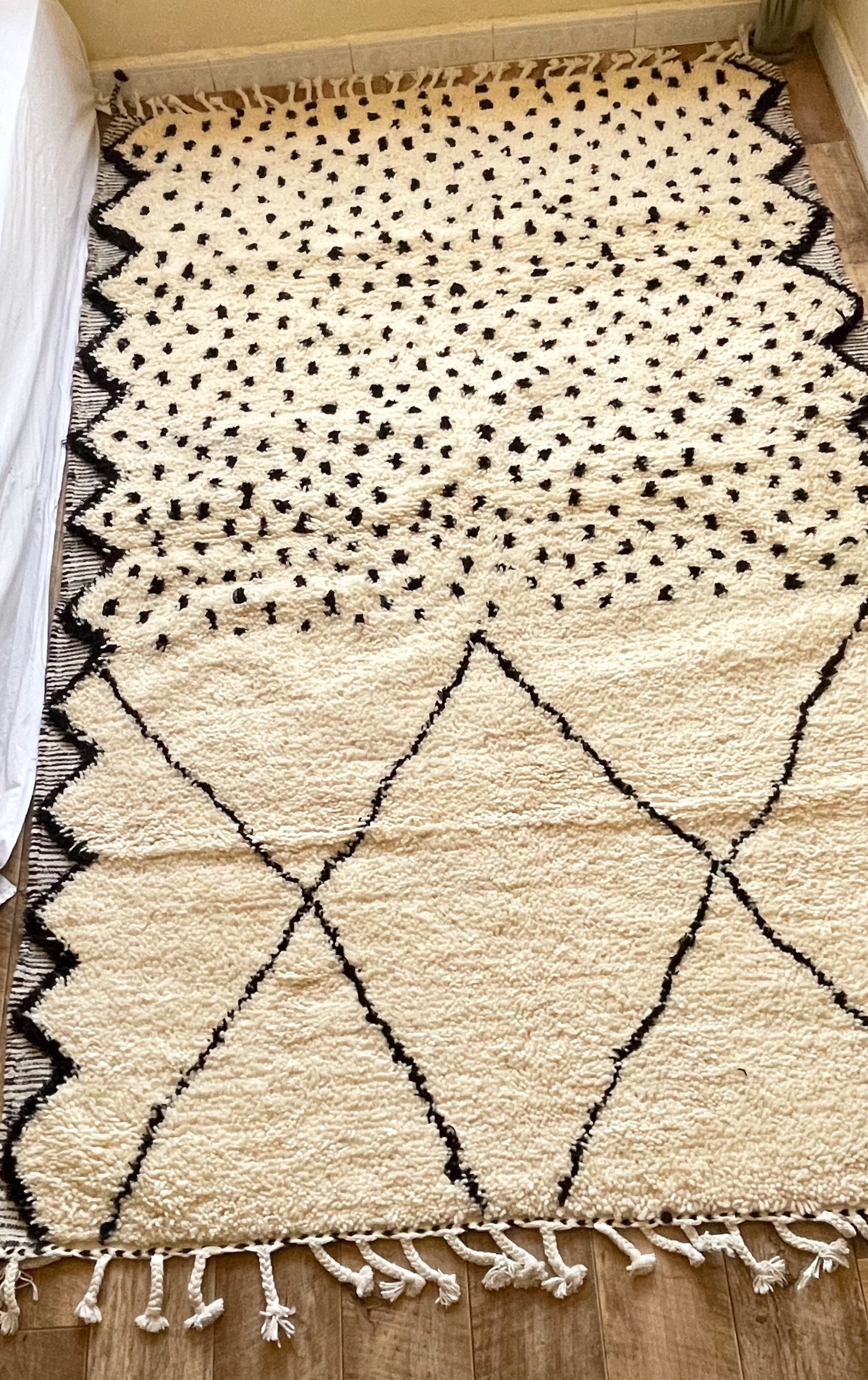 Betreten Sie eine Welt voller Exotik und Raffinesse mit Manisa, einem bezaubernden Béni Ouarain mit einer großzügigen Größe von 160 cm x 250 cm. Dieser prächtige Teppich zeichnet sich durch ein leuchtendes und zeitloses Beige aus, dessen eine Hälfte mit großen schwarzen Rauten und die andere Hälfte mit gesprenkelten schwarzen Tupfen verziert ist und ein äußerst faszinierendes stilistisches Bild ergibt. Jede Faser besteht aus Schafwolle und ist mit Baumwollmustern verziert. Sie erzählt die Geschichte der geschickten Hände, die sie geformt haben, wodurch ein einzigartiges Stück voller Berber-Authentizität entsteht. Integration und Harmonie: Manisa ist ein Stil-Chamäleon. Es fügt sich majestätisch in ein Wohnzimmer, ein elegantes Büro oder ein elegantes Schlafzimmer ein. Es passt wunderbar zu Creme-, Gold- und Bronzetönen oder ergänzt kräftige Farbtöne und verleiht jedem Raum einen Hauch von Berber-Luxus. In einem Wohnzimmer mit moderner Dekoration oder unter einem rustikalen Holztisch bringt Manisa einen Hauch von Exotik und verwandelt das Gewöhnliche in Außergewöhnliches.