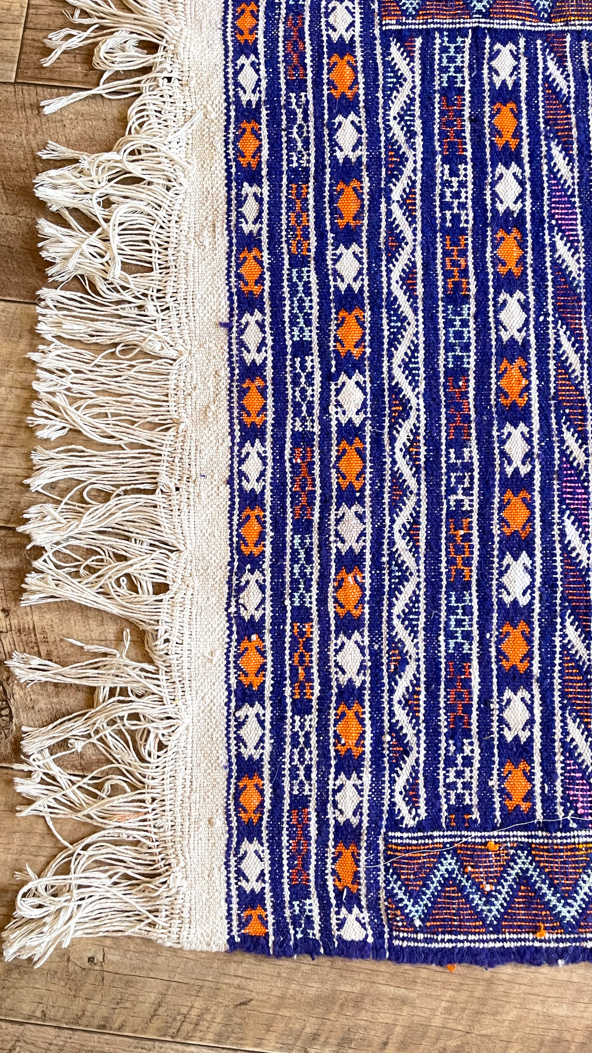 Nawa, ein außergewöhnlicher Kelim, erstrahlt in einer Symphonie aus Blau, Türkis, verschiedenen Rosatönen, Orange und Weiß auf einem tiefblauen Hintergrund und erinnert an die Geheimnisse des Meeresbodens und die Pracht des Sternenhimmels. Dieser einzigartige Teppich mit den Maßen 72 cm x 168 cm, der Schafwolle und Baumwolle kombiniert, ist eine Reise durch überlieferte Berbermotive, die an traditionelle Tätowierungen und die Epen nomadischer Stämme erinnern.