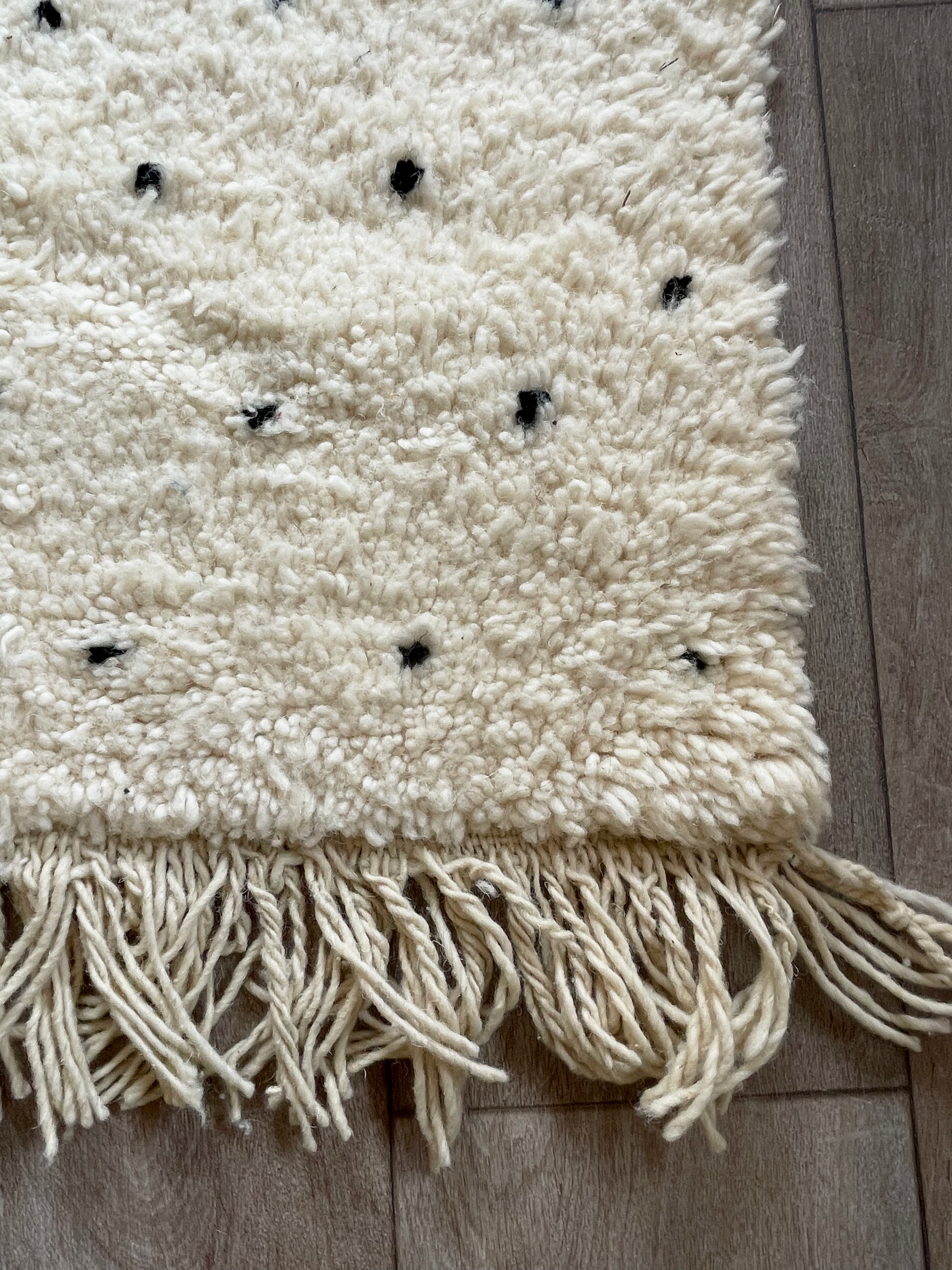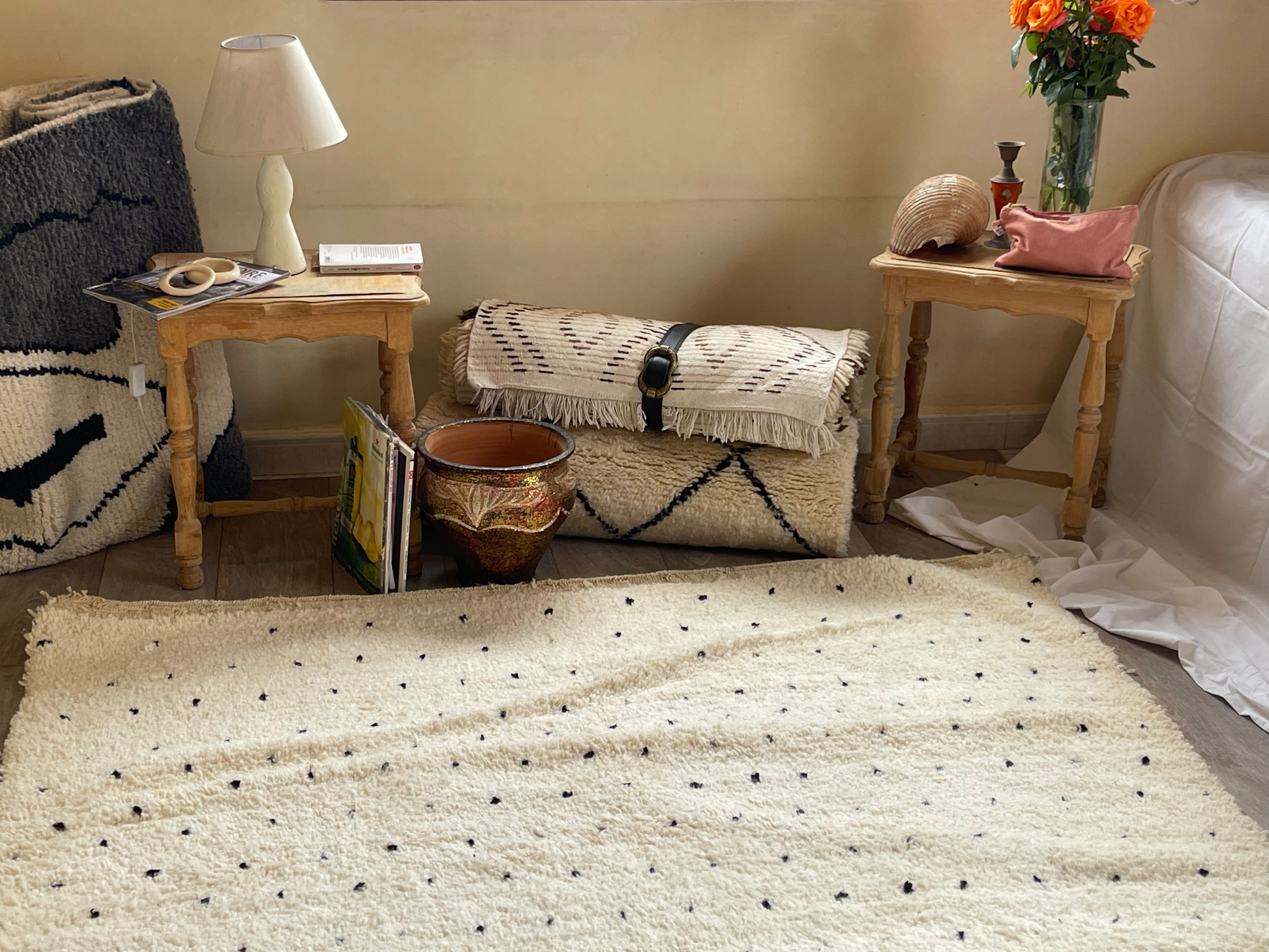 Tauchen Sie ein in eine Welt voller Luxus und Eleganz mit Sofya, einem Teppich von Béni Ouarain, bei dem jede Faser eine Geschichte uralter Traditionen und unvergleichlichen Know-hows erzählt. Mit den Maßen 168 cm x 264 cm ist Sofya ein prächtiges, handgefertigtes und völlig einzigartiges Stück. Sanfte Beigetöne, ein Synonym für Gelassenheit und Reinheit, werden durch zarte, nicht aus Wolle bestehende Muster mit schwarzen Sprenkeln unterbrochen, die dem Erscheinungsbild subtile Tiefe und Faszination verleihen.