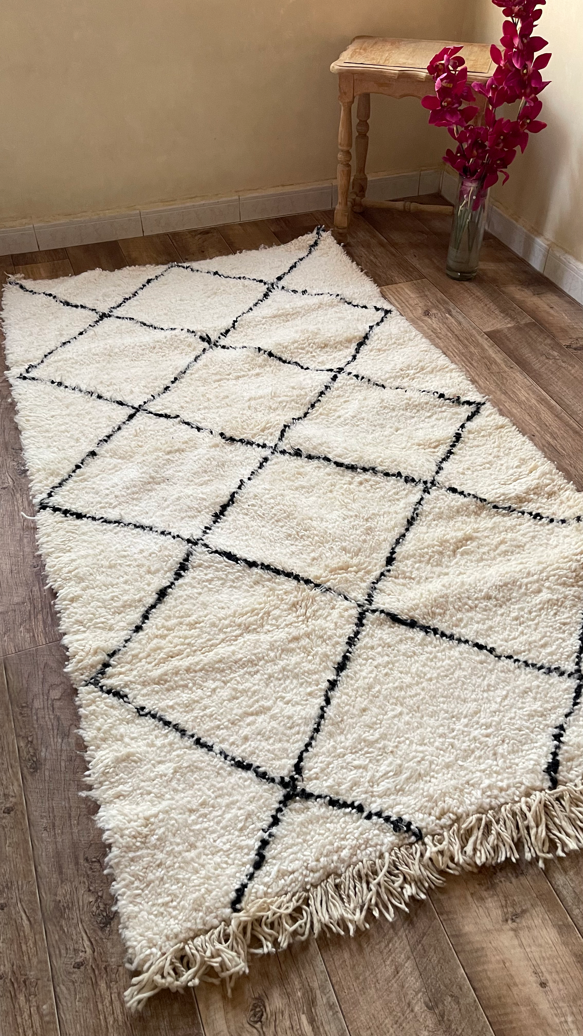 Zarqa, ein authentischer Béni Ouarain, ist das perfekte Spiegelbild der Eleganz und des Luxus marokkanischer Berber-Handwerkskunst. Dieses einzigartige, handgewebte Stück ist 105 cm x 190 cm groß und bietet eine Schafwolltextur von unvergleichlicher Weichheit in dezenten Elfenbein-Beige-Tönen. Die schwarzen Rautenmuster sind eine Hommage an den Reichtum und die Vielfalt der Berberkultur und verleihen jedem Raum einen Hauch von Exklusivität und Originalität.