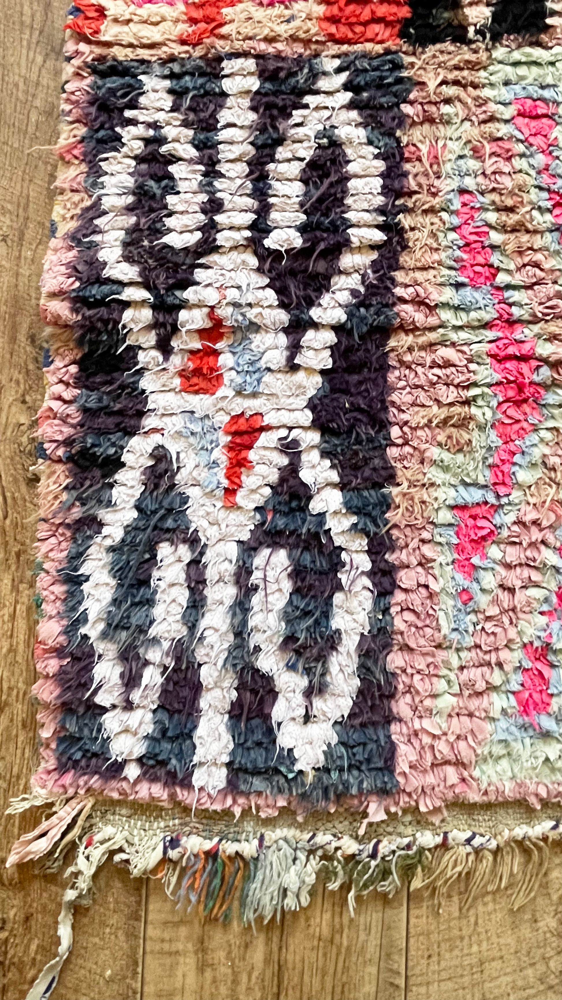 Dakhla est bien plus qu'un simple tapis Boucherouite, c'est un joyau vibrant des années 90, un témoignage vivant de l'art berbère ancestral. Avec des dimensions généreuses de 130 cm x 220 cm, cette pièce unique vintage est méticuleusement confectionnée à la main. Elle présente une mosaïque de rectangles ornés de couleurs diverses et de motifs géométriques berbères distinctifs à l'intérieur de chaque section.