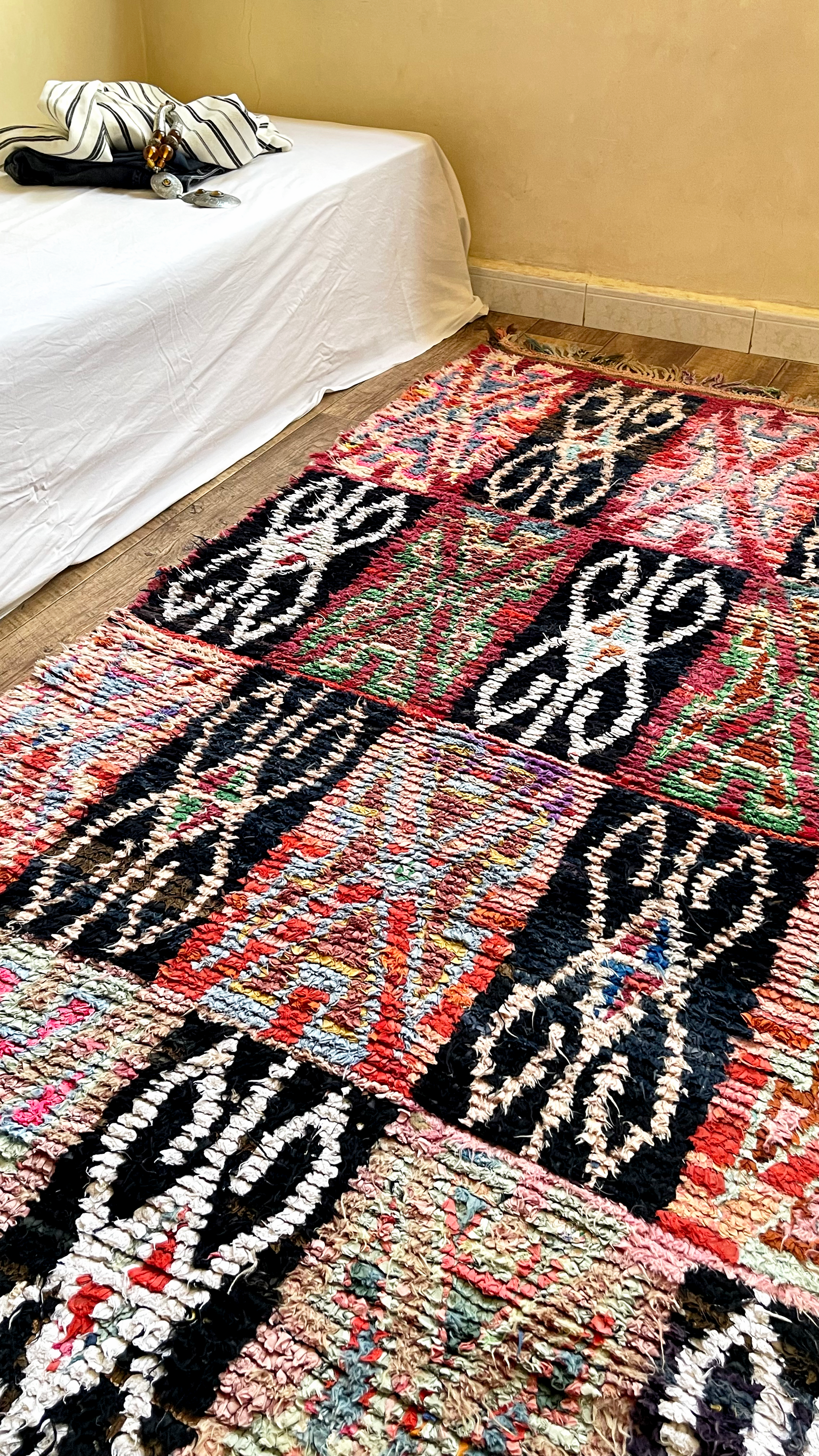Le charme rétro de ce tapis Boucherouite se marie à la perfection avec des intérieurs modernes, bohèmes ou éclectiques, ajoutant une touche de couleur et de créativité. Dakhla s'adapte avec aisance dans divers espaces tels que des salons animés, des chambres cosy ou des bureaux créatifs. Il se distingue par son énergie positive et sa palette polychrome, injectant joie et originalité dans chaque recoin de votre espace. Invitez la richesse colorée et l'énergie de Dakhla chez vous et plongez dans un voyage visuel à travers les motifs et les couleurs du Maroc traditionnel.