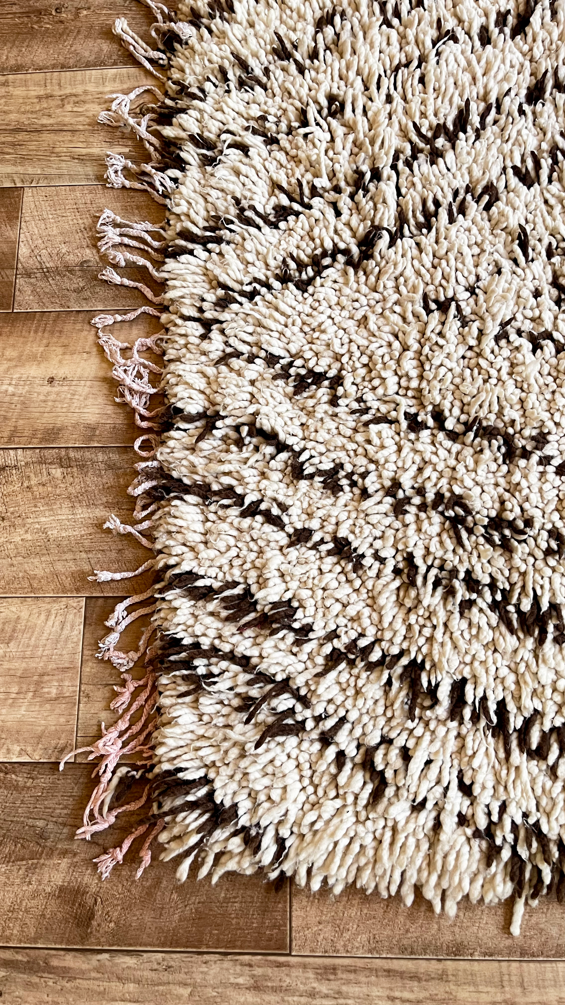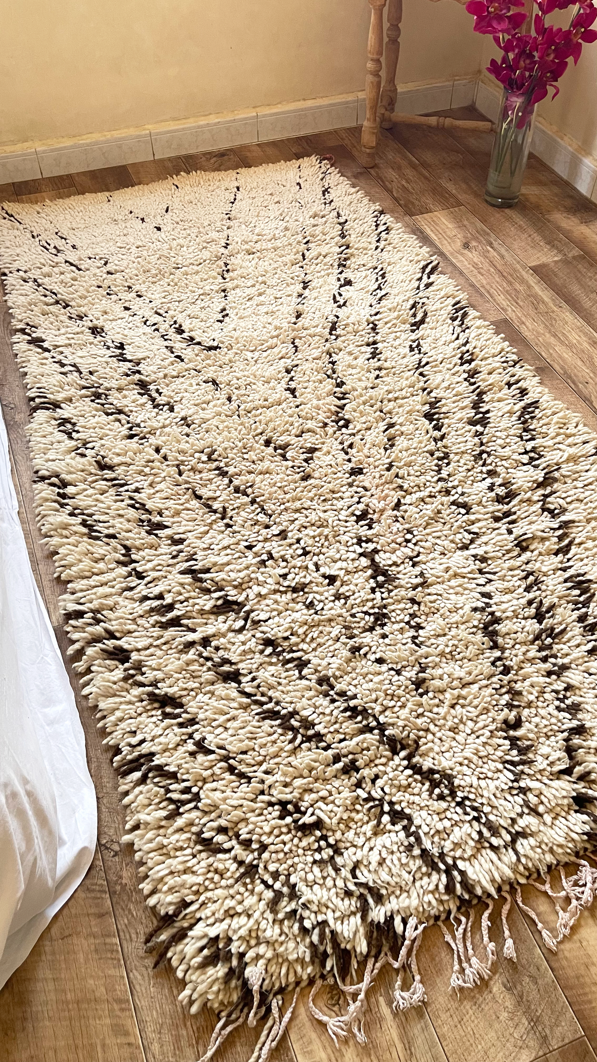 Jableh, un tapis exceptionnel de la fin des années 90, se présente comme une pièce unique de 107 cm x 208 cm qui vous enveloppe dans un voyage à travers les souvenirs berbères, évoquant les échos du désert marocain. Sur son fond beige doux comme les sables mouvants des dunes, s’ouvrent des lignes formant des V, tel un éventail déployé, en teintes marrons, évoquant les montagnes séculaires sous le crépuscule. Tissé à la main avec de la laine de mouton aux poils longs, ce tapis somptueux devient le témoin silencieux de l’héritage berbère, un symbole de l’artisanat raffiné et de la tradition ancestrale. Jableh transforme chaque espace en un sanctuaire de luxe et d’élégance, invitant l’histoire et la chaleur marocaine à infuser vos intérieurs de leurs richesses infinies. C'est une danse des textures et des nuances, une étreinte de confort et de finesse qui enchante vos pieds et embaume votre demeure de son aura intemporelle et mystérieuse. Laissez Jableh vous conter les légendes du Maroc, vous transporter à travers les vents du Sahara, et être le complice de vos moments de paix et de réflexion.